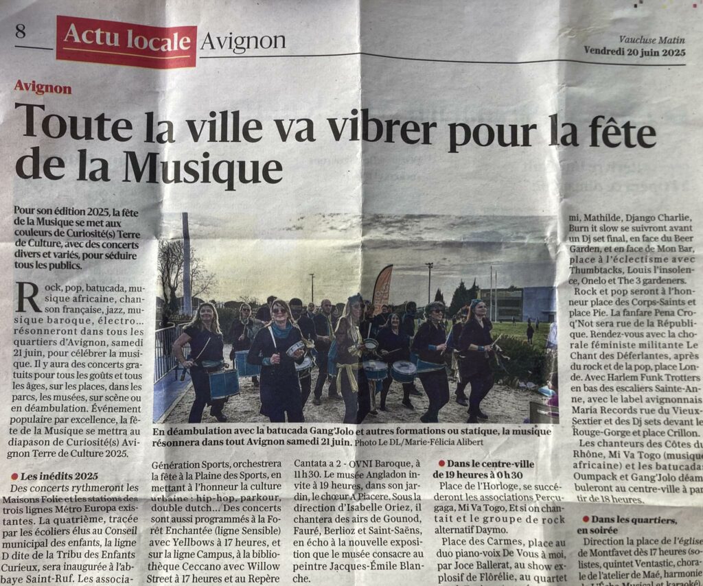 La batucada participe à divers événements à Avignon et ses alentours : ouverture de la parade du Festival Off 2022, fête de la musique d’Avignon, Carnaval (Festo Picho, Carvanal de Robion, sauveterre, Pernes-les-Fontaines ) et de Noël (marchés des créateurs des Carmes).